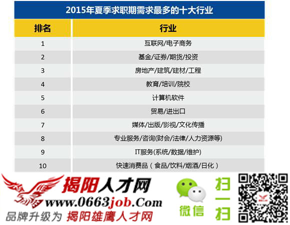 圖為2015年夏季求職需求最多的十大行業(yè),換句話講就是這些行業(yè)的發(fā)展勢頭較猛,屬于朝陽行業(yè),需要更多優(yōu)秀人才。相信大部分人都希望可以進入一個朝陽的行業(yè),在風口行業(yè)工作比在夕陽行業(yè)中努力更容易獲得成功。