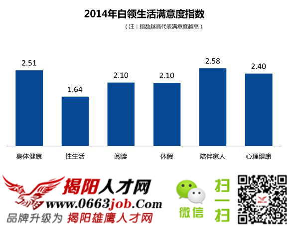 圖為2014年中國白領生活滿意度,中國白領最不滿意的是性生活,滿意度僅為1.64。過半中國白領每月性生活次數(shù)低于1次,其中,46.1%為單身;僅有約1/4的中國白領每周至少過1次性生活。加班、工作壓力較大、出差較多的工作有可能會導致陪伴家人/伴侶的時間大大減少,這也是需要大家考慮的因素之一。